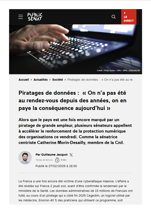 Dans un article publié le 27 février sur le site de Public Sénat, le journaliste Guillaume Jacquot revient sur l’appel lancé par plusieurs sénateurs dont Catherine Morin-Desailly pour accélérer le renforcement de la protection numérique des organisations, alors que le pays est une fois encore marqué par un piratage de grande ampleur.