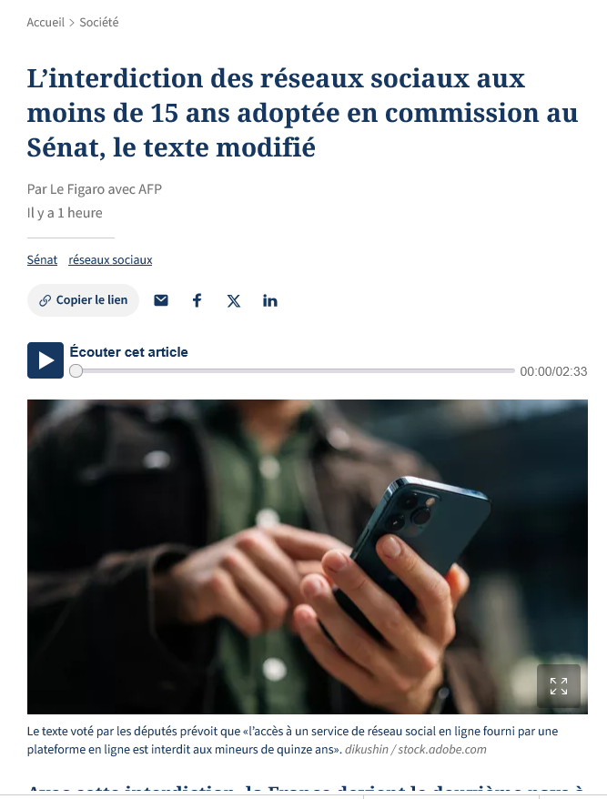 Le Figaro revient ce mercredi 25 mars sur l’adoption après modifications par la commission de la culture, de l’éducation, de la communication et du sport du Sénat de la proposition de loi visant à protéger les mineurs des risques auxquels les expose l’utilisation des réseaux sociaux, de la députée Laure Miller, ainsi que du rapport rédigé pour la commission par Catherine Morin-Desailly.