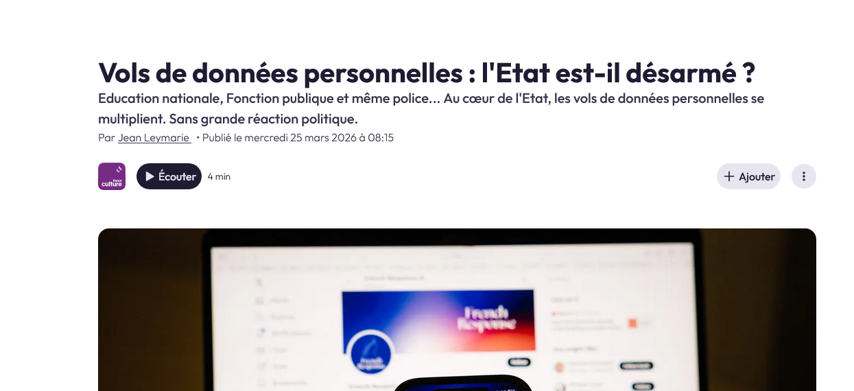 Ce mercredi 25 mars, le journaliste Jean Leymarie revient dans la matinale de France Culture sur les cyberattaques d’ampleur dont les administrations sont victimes depuis plusieurs semaines et sur la nécessité d’une réponse adaptée par l’Etat, en préambule de la question au gouvernement que Catherine Morin-Desailly posera cet après-midi en séance au Sénat.