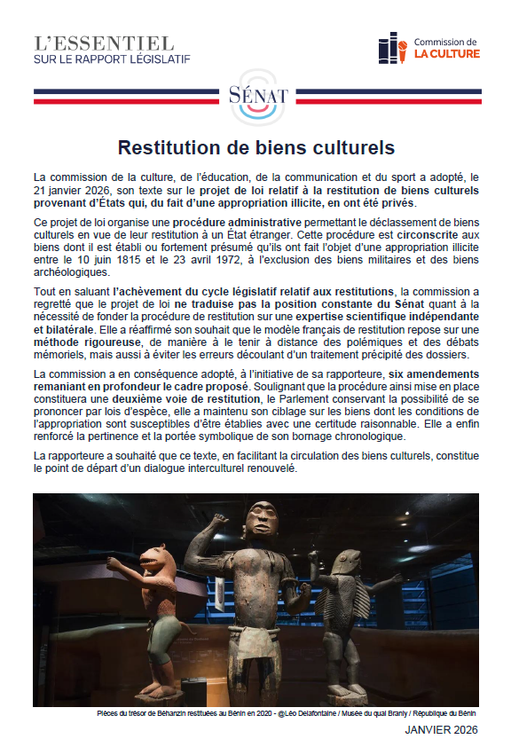 Le 21 janvier 2026, Catherine Morin-Desailly a présenté au nom de la Commission de la culture, de l’éducation, de la communication et du sport le rapport sur le projet de loi relatif à la restitution de biens culturels provenant d’États qui, du fait d’une appropriation illicite, en ont été privés.