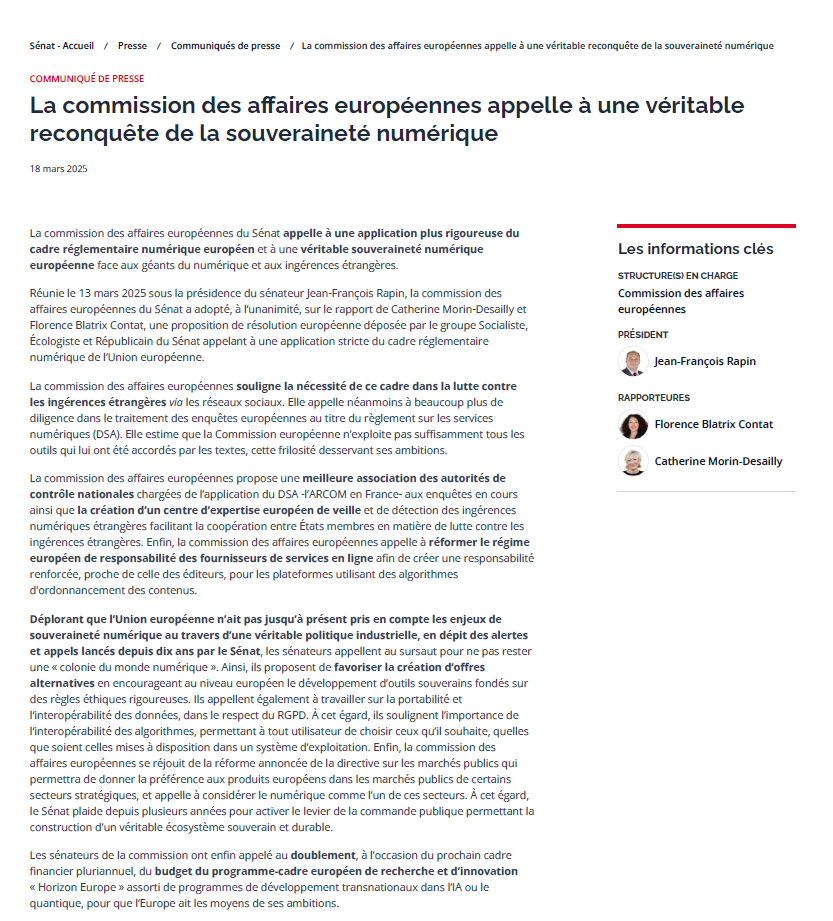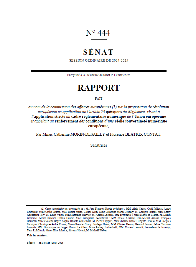 Le 13 mars 2025, les sénatrices Catherine Morin-Desailly et Florence Blatrix Contat ont présenté au nom de la commission des affaires européennes du Sénat le rapport sur la proposition de résolution européenne en application de l’article 73 quinquies du Règlement, visant à l’application stricte du cadre réglementaire numérique de l’Union européenne et appelant au renforcement des conditions d’une réelle souveraineté numérique européenne. Le rapport a été adopté à l’unanimité par la commission. La résolution a été adoptée par le Sénat le 18 avril 2025.