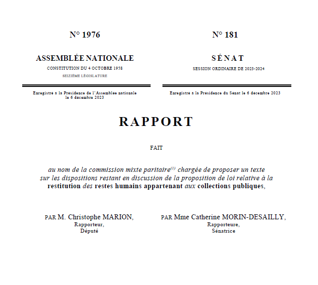 Le 6 décembre 2023, la sénatrice Catherine Morin-Desailly et le député Christophe Marion ont présenté au nom de la commission mixte paritaire le rapport sur les dispositions restant en discussion de la proposition de loi relative à la restitution des restes humains appartenant aux collections publiques
