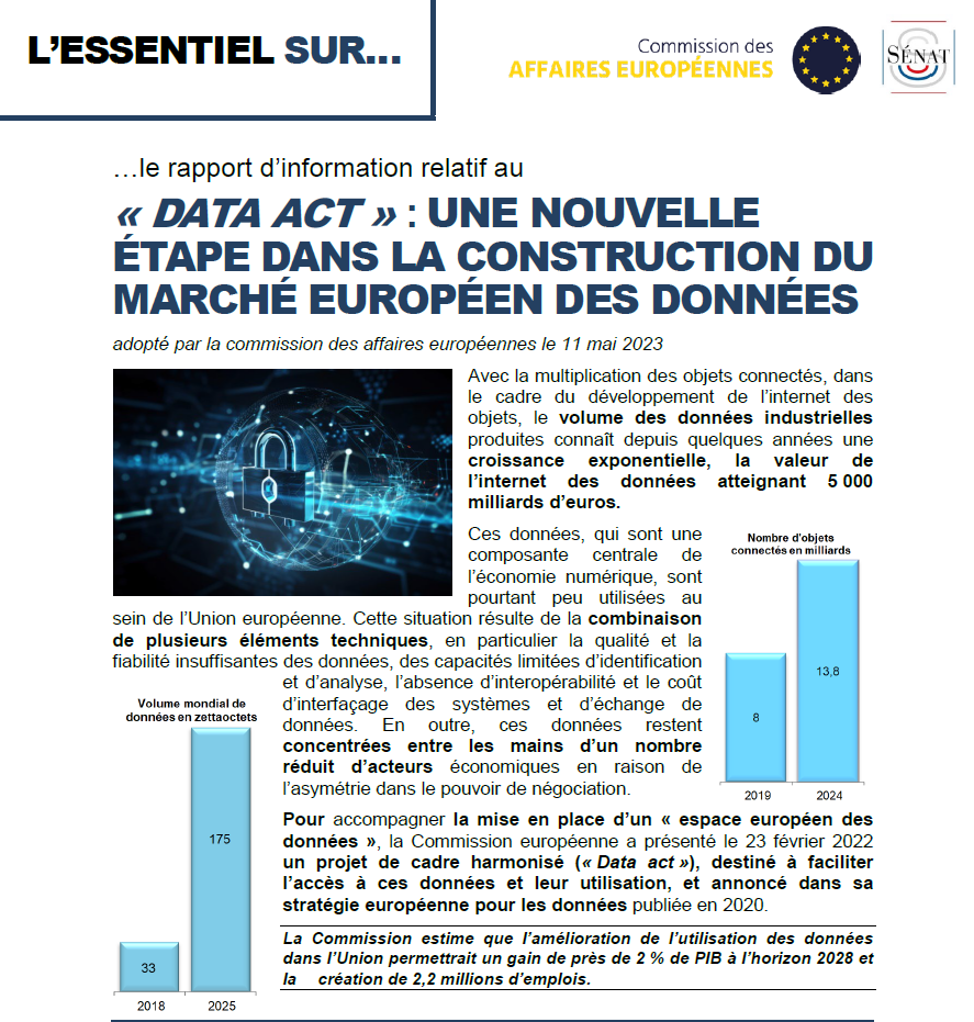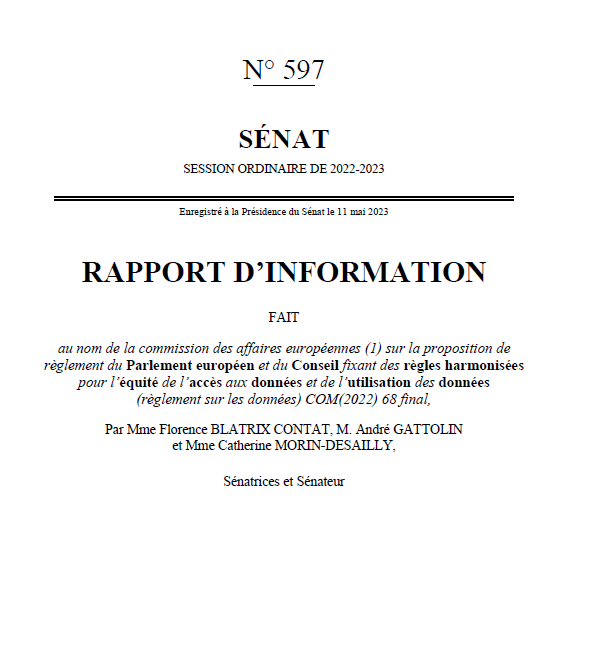 Le 11 mai 2023, les sénateurs Catherine Morin-Desailly, Florence Blatrix Contat et André Gattolin ont renu au nom de la Commission des affaires européennes du Sénat un rapport d’information sur la proposition de règlement du Parlement européen et du Conseil fixant des règles harmonisées pour l’équité de l’accès aux données et de l’utilisation des données (règlement sur les données) COM(2022) 68 final.
