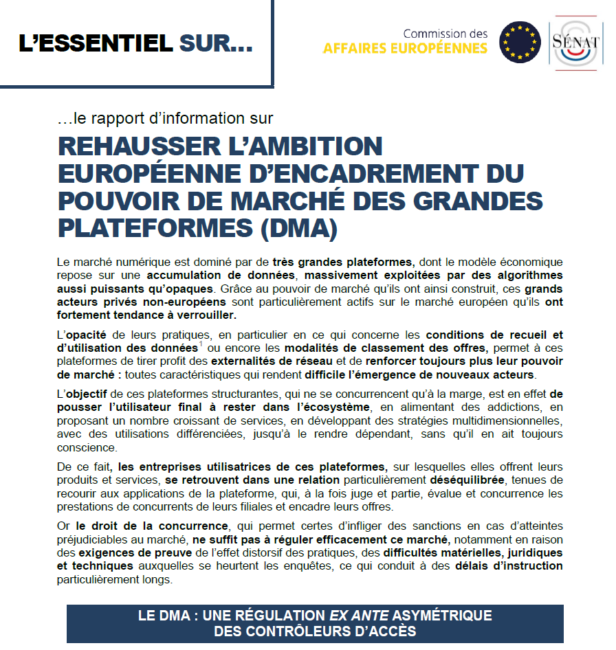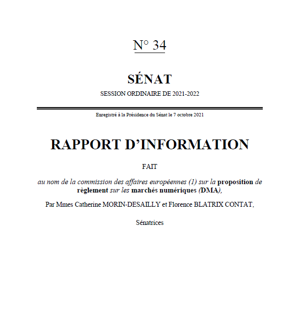 Le 7 octobre 2021, les sénatrices Catherine Morin-Desailly et Florence Blatrix Contat ont rendu au nom de la Commission des affaires européennes du Sénat un rapport sur la proposition de résolution de la commission relative à la proposition de règlement européen sur les marchés numériques (DMA).