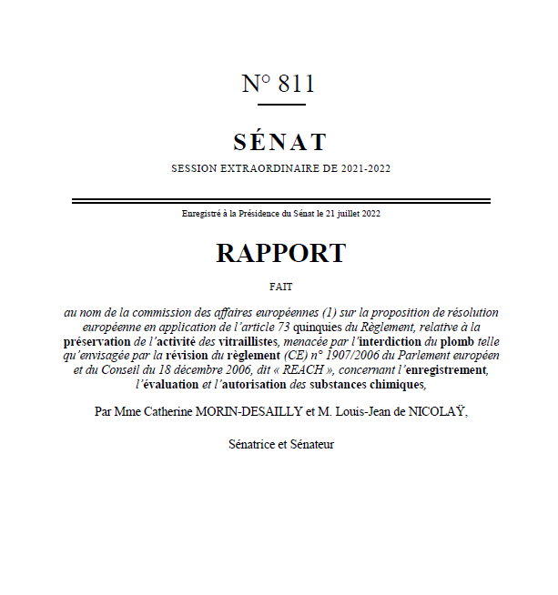 Le 21 juillet 2022, les sénateurs Catherine Morin-Desailly et Louis-Jean De Nicolay ont présenté au nom de la Commission des affaires européennes du Sénat un rapport sur la proposition de résolution relative à la préservation de l’activité des vitraillistes, menacée par l’interdiction du plomb, dont ils sont également co-auteurs.