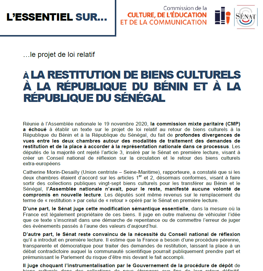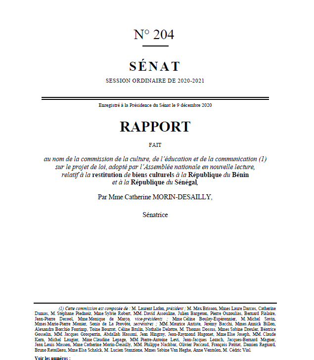 Le 9 décembre 2020, Catherine Morin-Desailly a rendu un nouveau rapport sur le projet de loi relatif à la restitution de biens culturels à la République du Bénin et à la République du Sénégal au nom de la Commission de la culture, de l’éducation et de la communication, à l’occasion de l’examen du texte en deuxième lecture au Sénat.