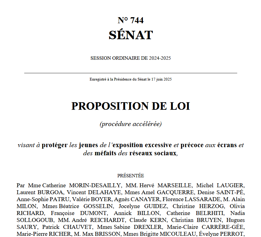 Elle a néanmoins poursuivi ses travaux sur le sujet. Face à la persistance de la problématique et la prévalence toujours croissante du numérique dans nos vies et celles de nos enfants, elle a déposé une nouvelle proposition de loi le 17 juin 2025, en parallèle d’une proposition de résolution européenne sur la protection des mineurs en ligne.