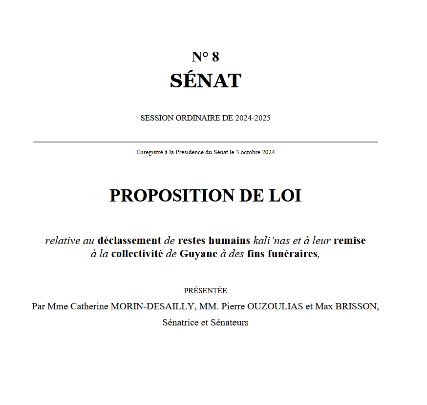 Le 3 octobre 2024, les sénateurs Catherine Morin-Desailly, Pierre Ouzoulias et Max Brisson ont déposé au Sénat une proposition de loi relative au déclassement de restes humains kali’nas et à leur remise à la collectivité de Guyane à des fins funéraires.