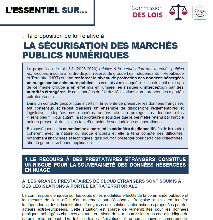 Ce texte s’inscrit pleinement dans les travaux qu’elle mène depuis plusieurs années sur la souveraineté numérique sur nos données ainsi dans ceux réalisés au premier trimestre 2025 dans le cadre de la commission d’enquête du Sénat sur les coûts et les modalités effectifs de la commande publique.