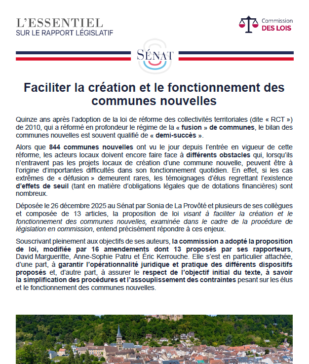 Ce texte vise à répondre aux difficultés auxquelles les acteurs locaux doivent encore faire face qui, lorsqu’elles n’entravent pas les projets locaux de création d’une commune nouvelle, peuvent être à l’origine d’importantes difficultés dans son fonctionnement quotidien.